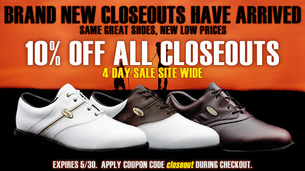 10% off all men's closeout golf shoes on GolfShoesOnly.com with coupon code: closeout. Includes Adidas, Etonic, FootJoy, & Nike at up to 75% off retail. Sale ends Friday, 5/30/08.